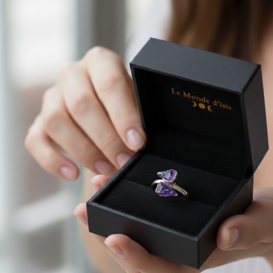 La Bague Améthyste 2 Pointes est un bijou énergétique profond, conçu pour accompagner le calme intérieur, l’intuition et la clarté de l’esprit.